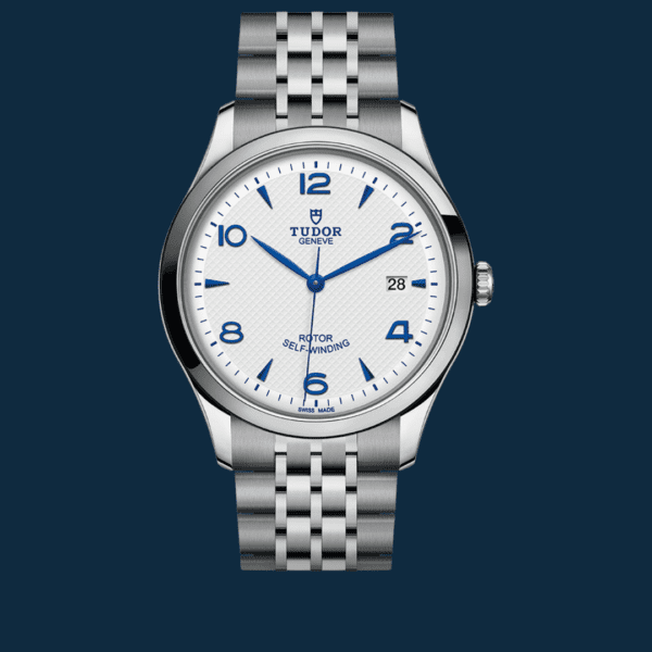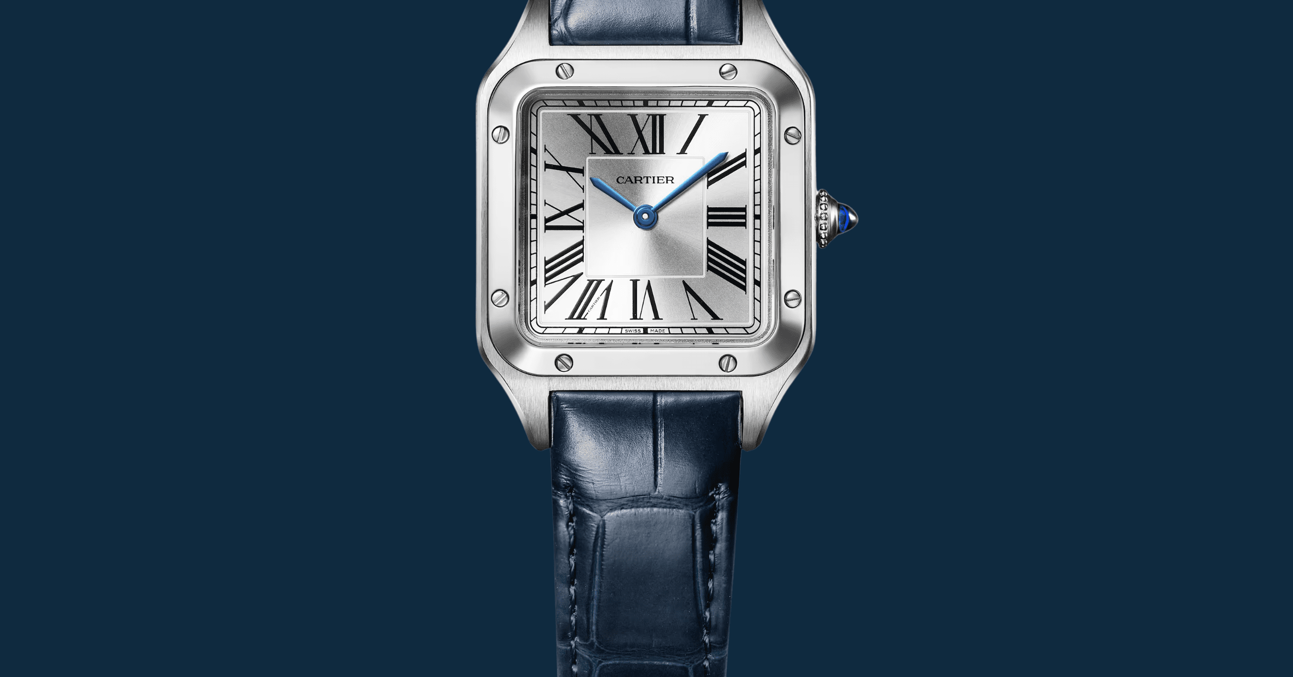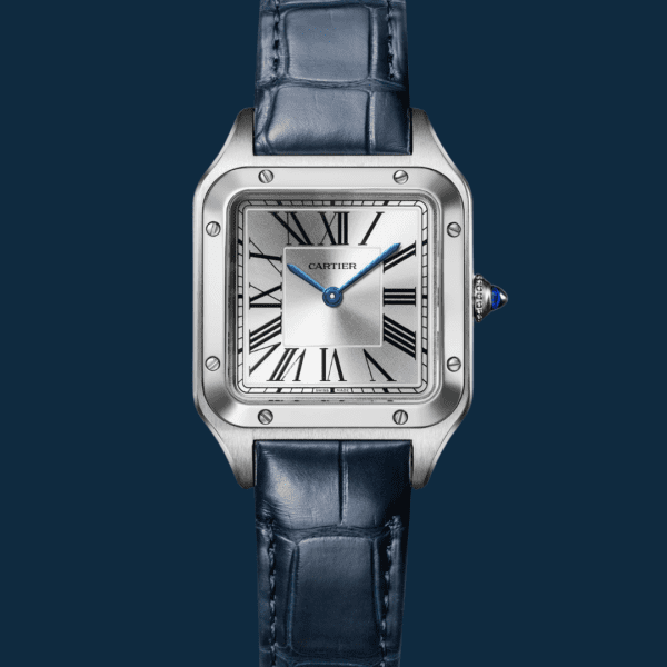 The silvered opaline dial features Cartier’s signature Roman numerals, blued steel sword hands, and the classic chemin de fer minute track. Finished with a blue cabochon crown, every detail is pure Cartier.