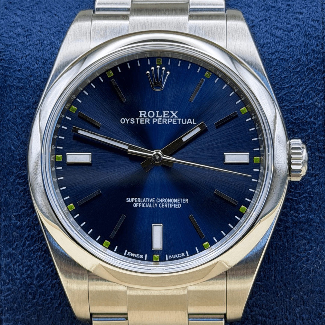 The Rolex Oyster Perpetual 39 is Rolex at its purest, clean, confident, and quietly iconic. This 2016 example pairs the perfectly balanced 39mm Oystersteel case with the now-discontinued sunburst blue dial featuring the signature green lume accents unique to this generation.